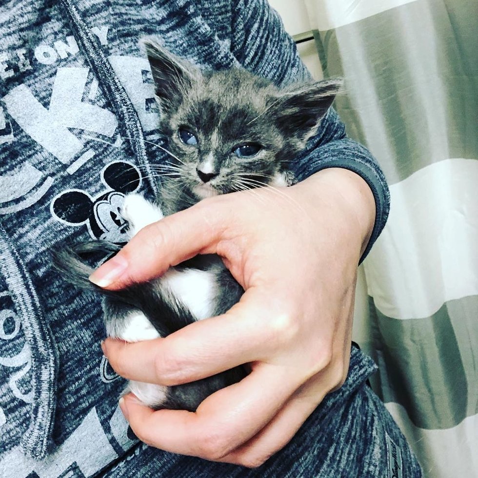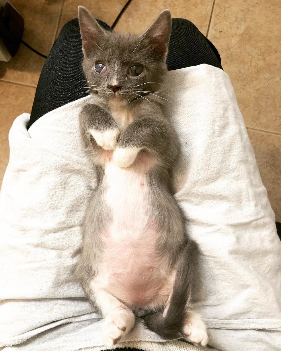 The little gray kitten, Lily, was just 1/3 of her normal weight. She couldn't see through her eyes and was very lethargic and barely had any strength to lift her head up.