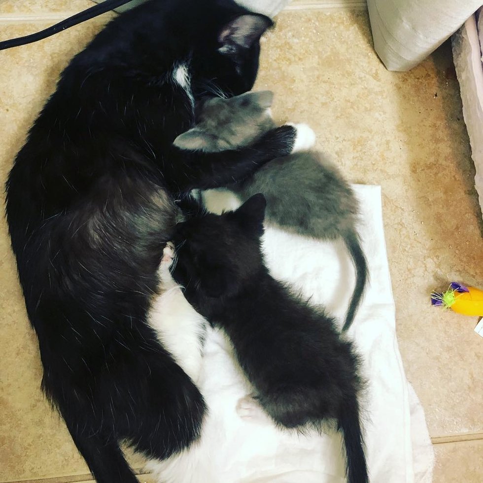 Despite having no milk, the sweet mama will lie down and let her kittens nurse on her for comfort.