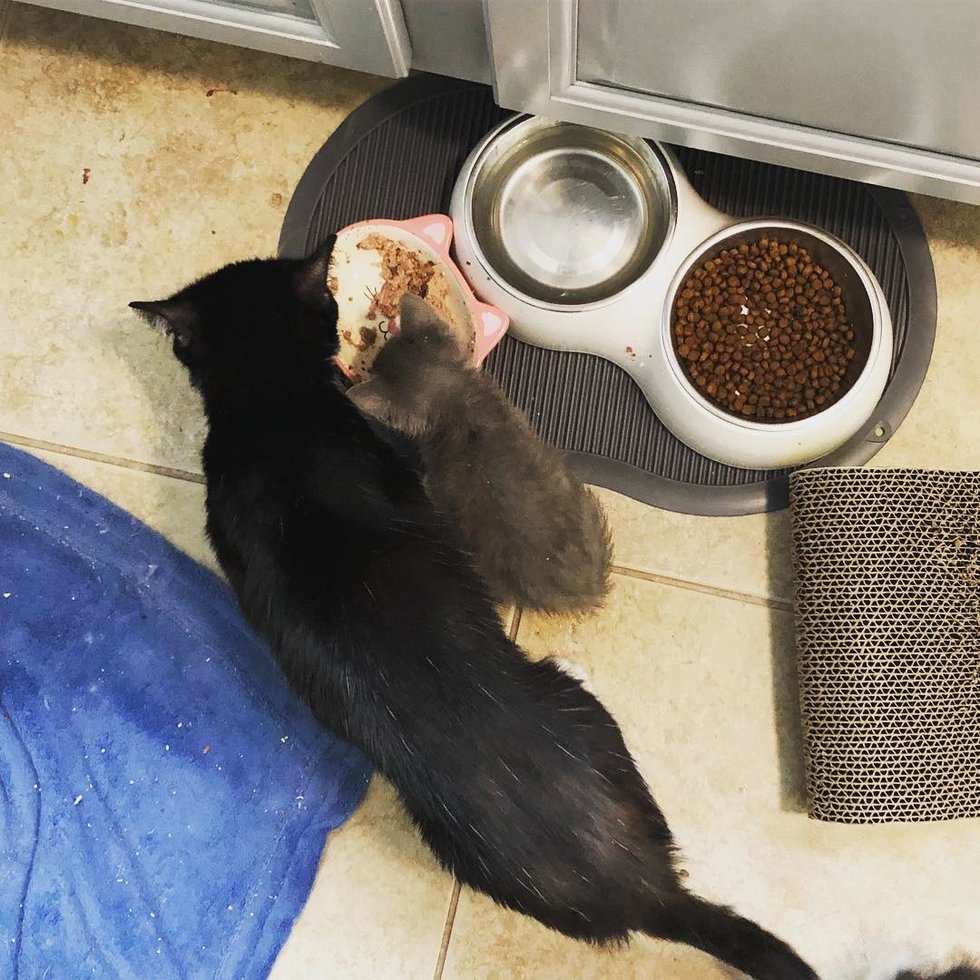 "Lily loves chasing her mama's tail. Her sight seems to be gone in her right eye but her left eye is doing double duty. She has turned into my purr machine and eats like a champ and loves to snuggle on my lap and play."