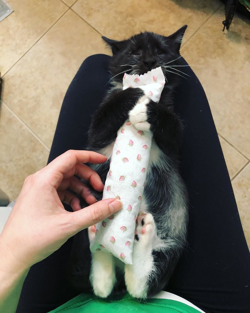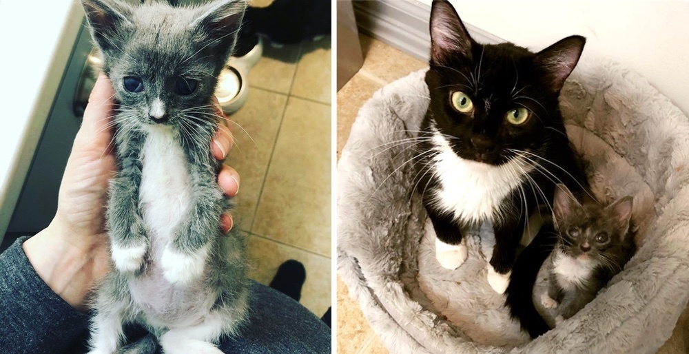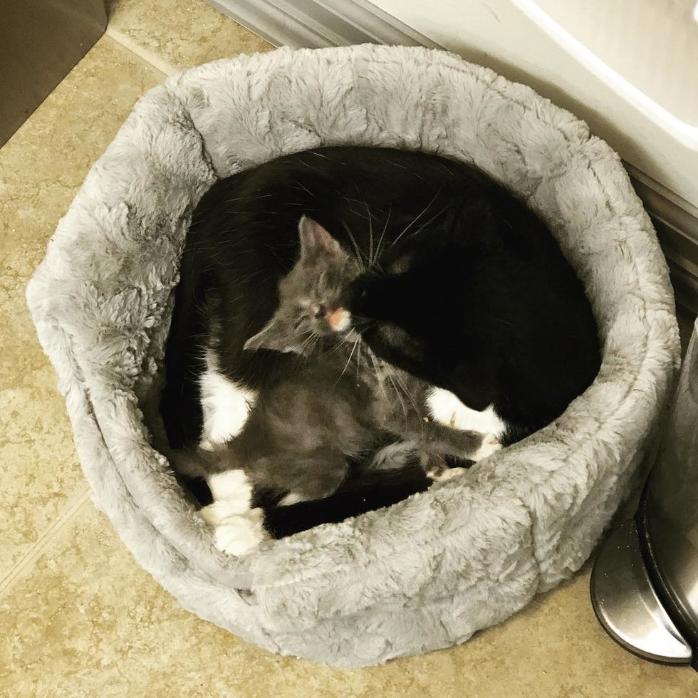 "Dominic (the tuxedo kitten) is fully blind but seemed to thrive immediately."