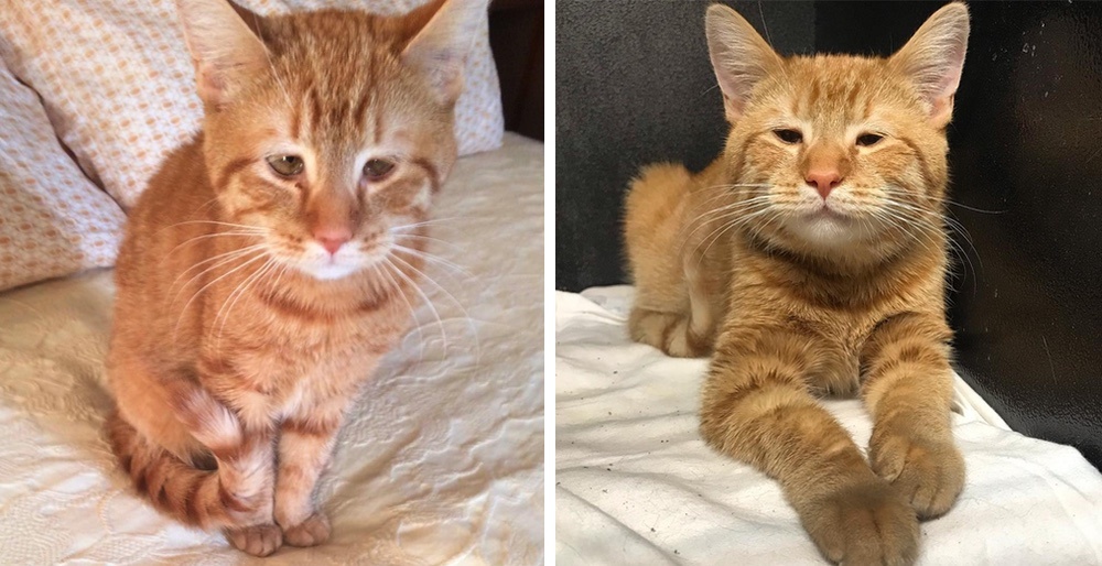 Right away, they noticed his perpetual frown, but the kitty wasn't sad at all. He was born with a congenital condition called microphthalmia, in which the eyeballs are much smaller than normal.