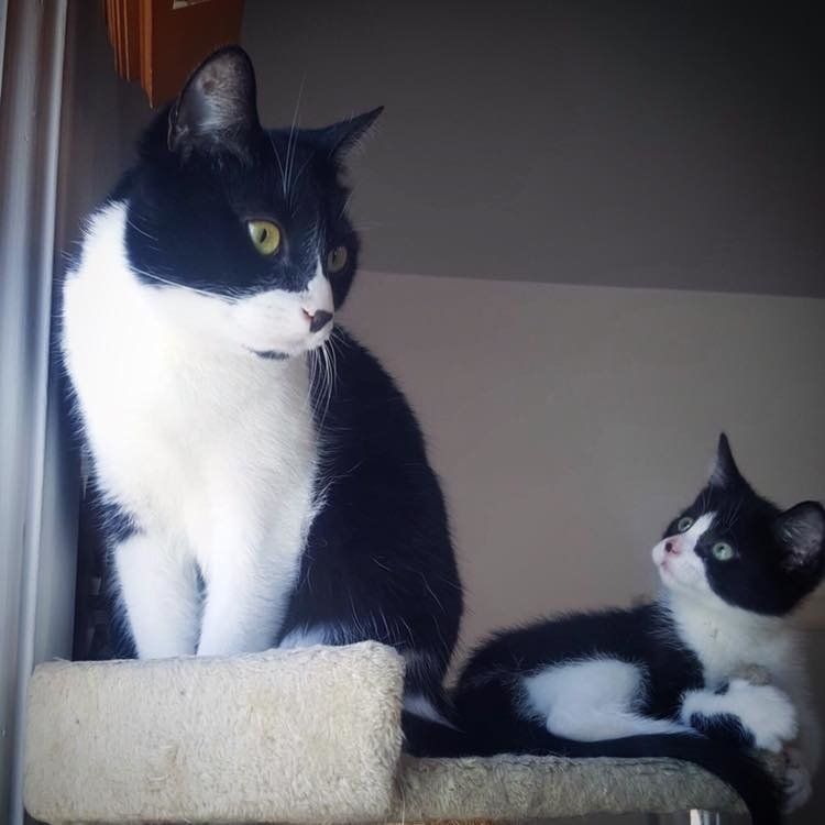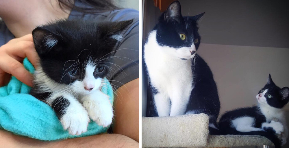 A kitten, who was rescued all alone, found another tuxedo cat and wouldn't let go.