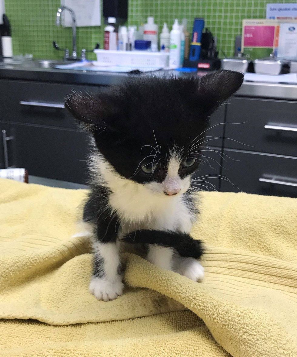 The scrawny little kitten was malnourished and dehydrated. They immediately gave him fluids to rehydrate, started him on antibiotics to help him heal and fed him with a syringe.