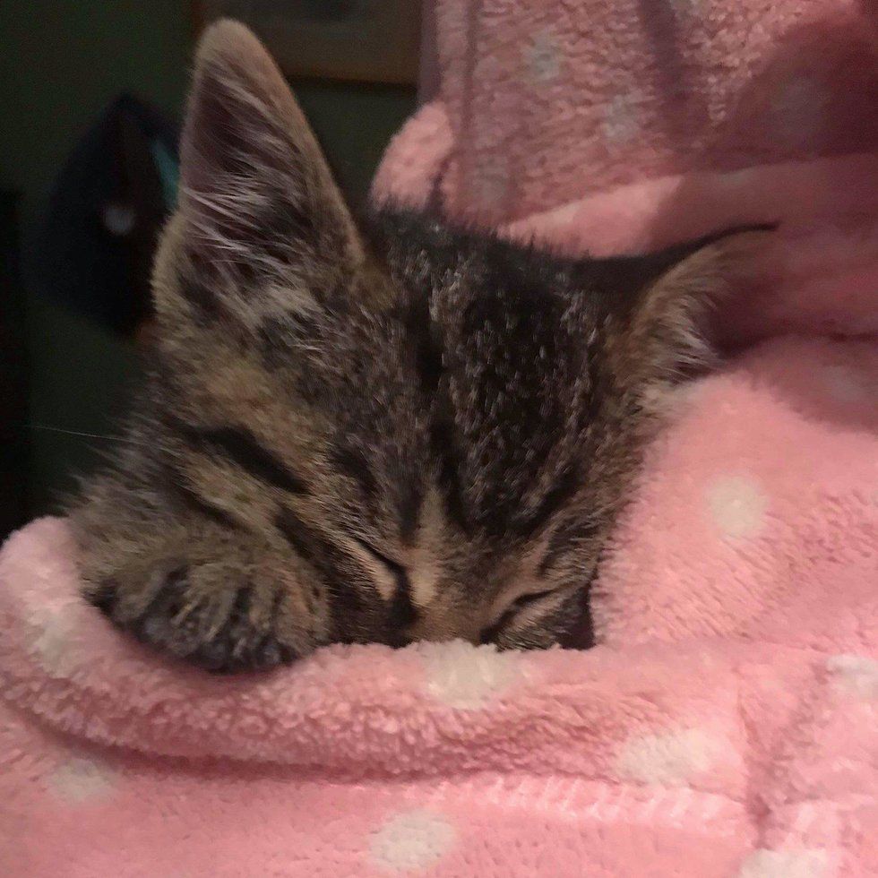 She put the kitten in her bathrobe pocket and the little one fell asleep in it, purring away.