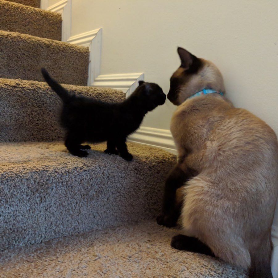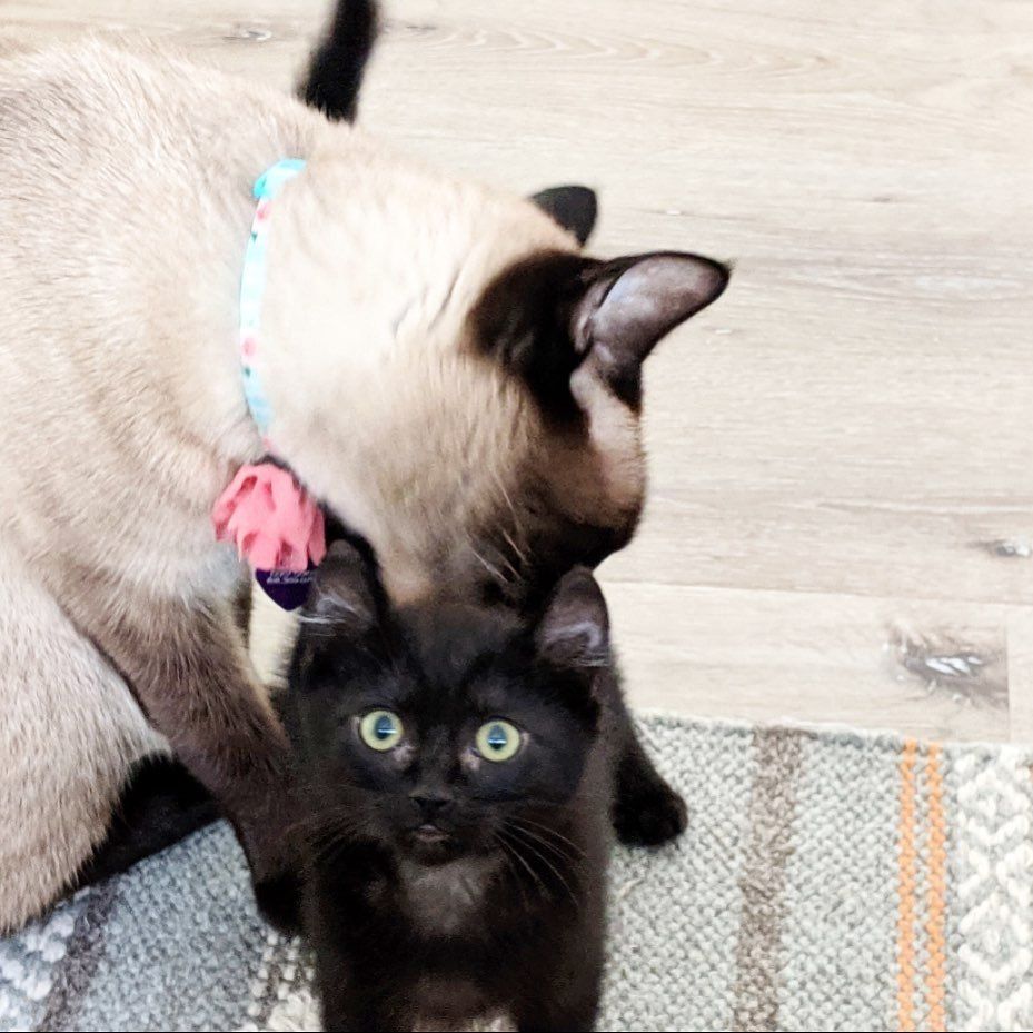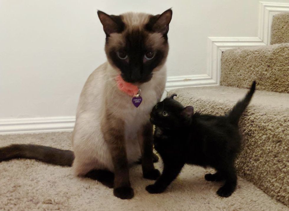 A rescued kitten met a Siamese cat at her foster home. She fell in love and insisted on being her best friend.