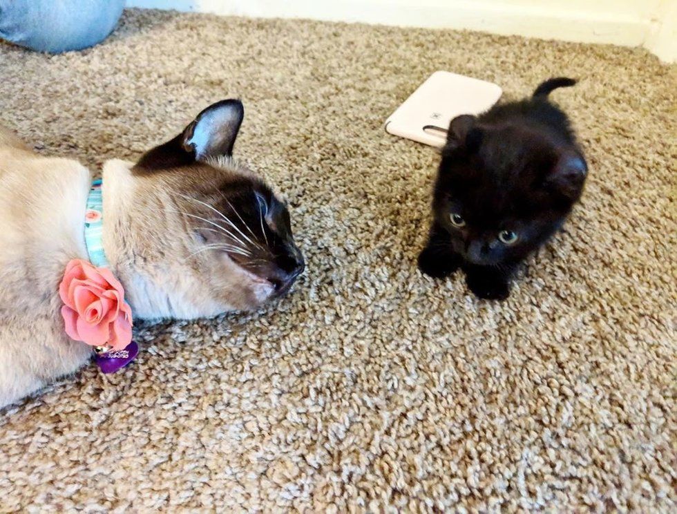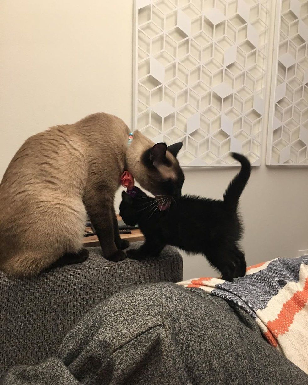 The couple has a beautiful rescued Siamese, Charlotte, who was a bit confused by the tiny newcomer. But Domino became her biggest fan and walked right up to greet her.