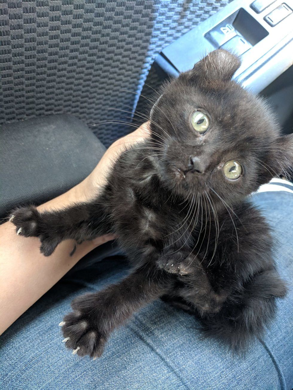 Domino the kitten was born with curled ears and extra toes (polydactyl Highlander cat). She was found as a stray along with her brother and brought to Carson Animal Shelter in California. Her brother was quickly adopted but Domino remained behind, waiting for someone to rescue her.