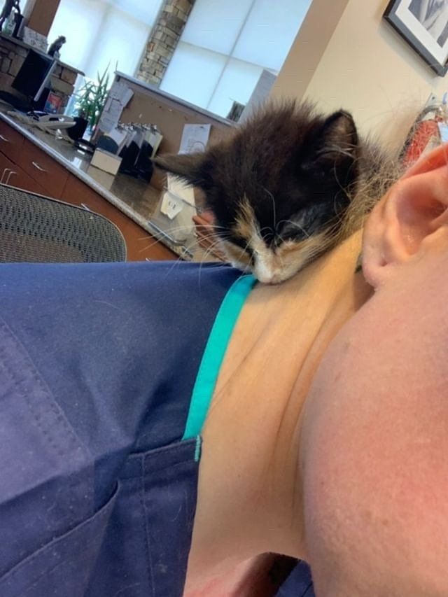 "She was found as a stray on someone's property. When she got on my chest, she didn't want to leave," Katie told Love Meow.