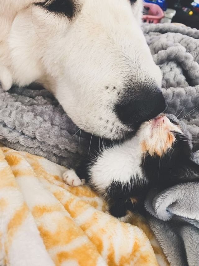 Knowing that Mala needed a buddy to cuddle constantly, Katie wanted to try pairing her up with the new kitten. Mala walked right up to her and started to snuggle.
