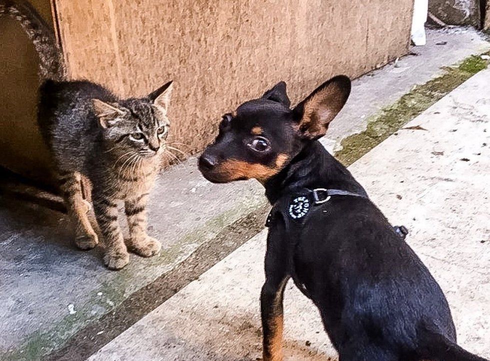 She brought the kitten some food and treats in hopes of gaining his trust. Whenever she was out with Taco, the kitten was there, eager to play with him. Soon, the tabby would show up in front of their building, waiting for Taco.