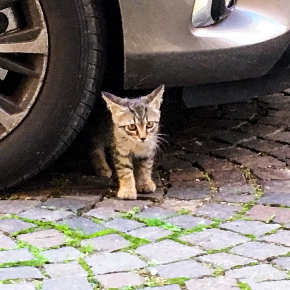 One day, while she was out with Taco, she noticed a tabby kitten under a car in an alley by her building. When he and Taco locked eyes, the kitty slowly emerged from under the vehicle and made his way up to the pup.