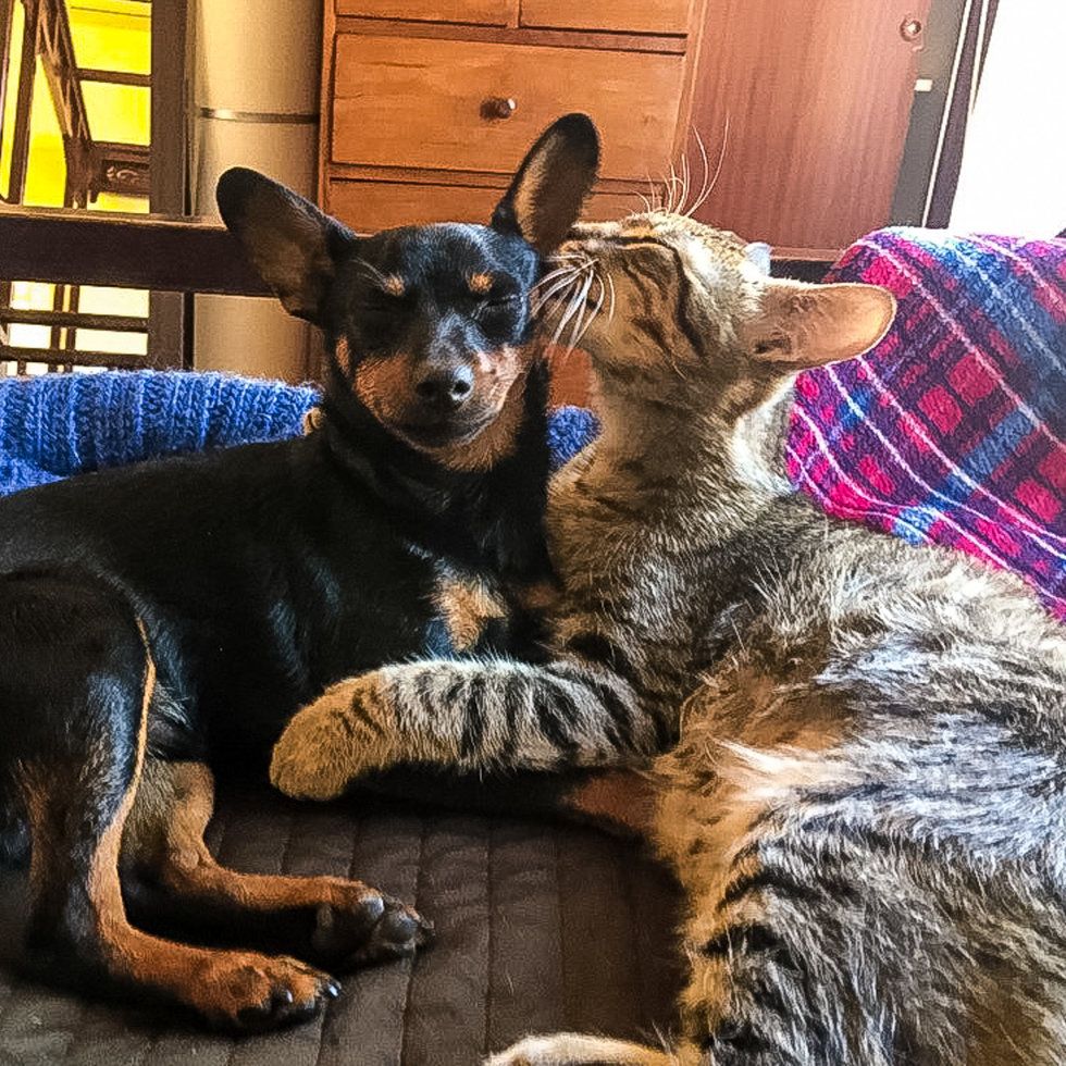 The tabby was scared at first and kept trying to find a place to hide, but once he realized Taco was with him and that he was safe, he began to clam down and even started to purr.