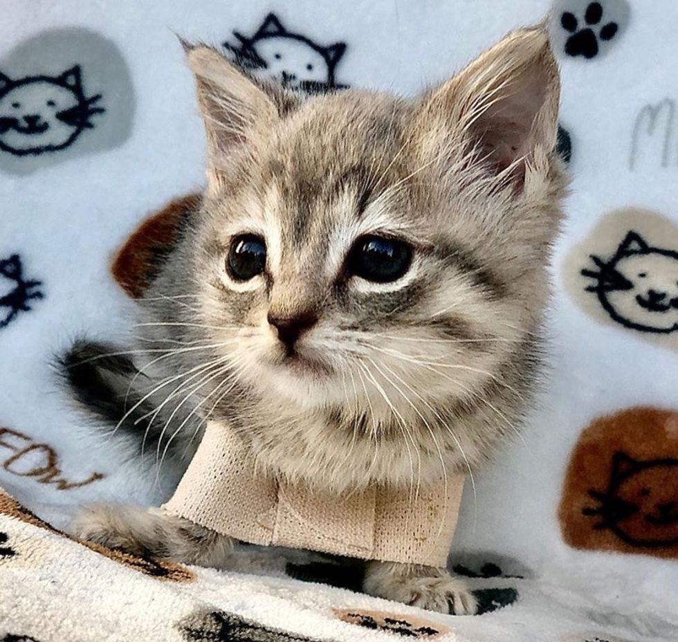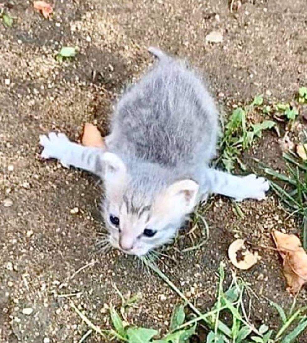 A gray kitten was found outside, struggling to walk. Her front legs were splayed out to the sides as she tried to move around. A Good Samaritan scooped her up and reached out to a local rescue in North San Diego County, California, for help.