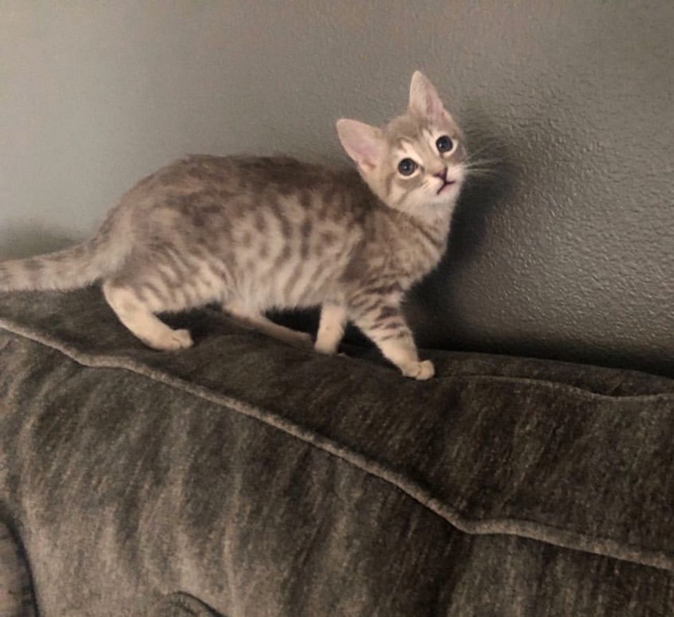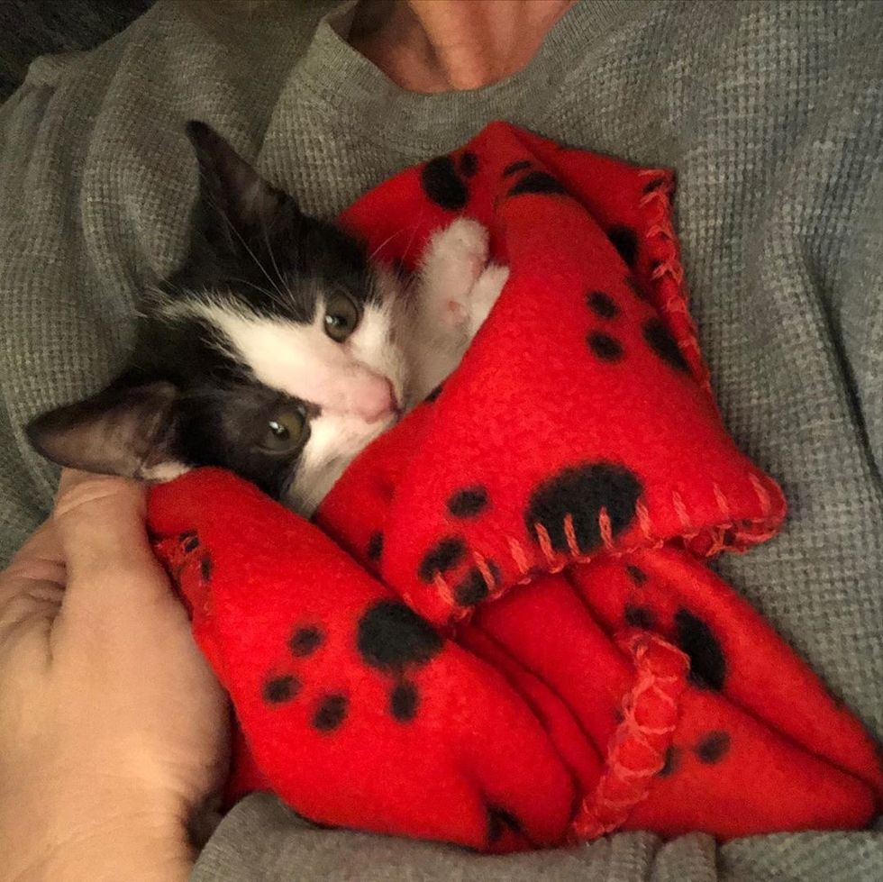 The kitten was diagnosed with Swimmers Syndrome, an uncommon developmental abnormality. After a couple of weeks of intense care, the kitten went home with Heather Thomas and her daughter Keely, both foster volunteers of the rescue, to continue her recovery.