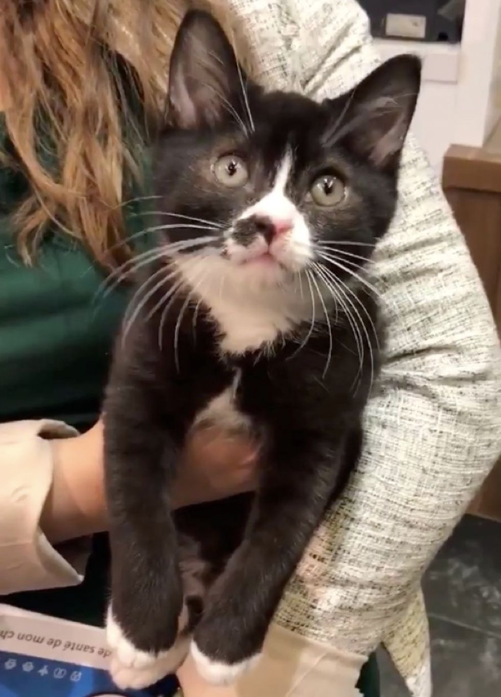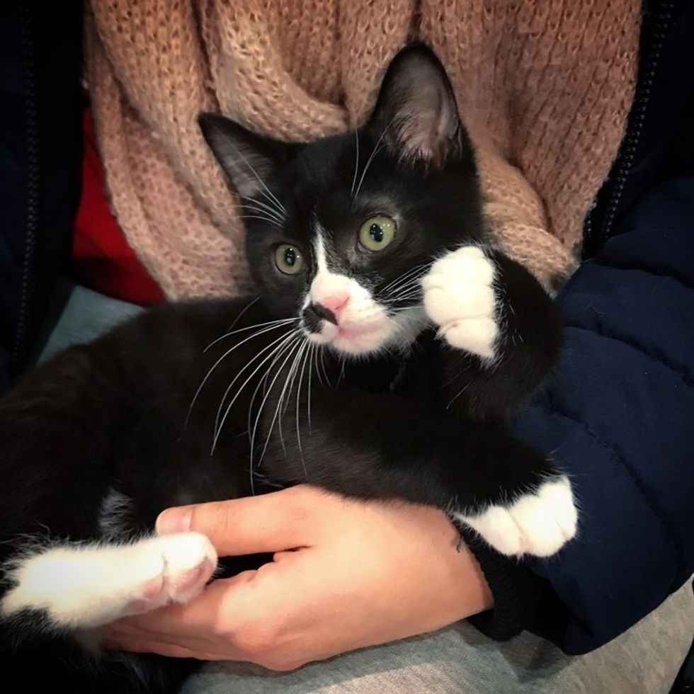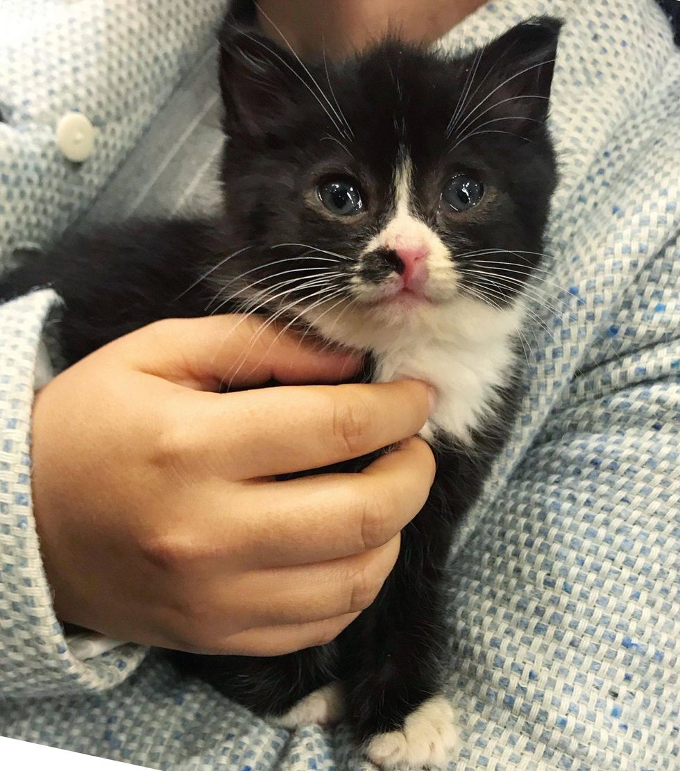 Jess, a foster volunteer of the rescue, came to pick him up. When she held him in her arms, the little tuxedo nuzzled right in and started purring.