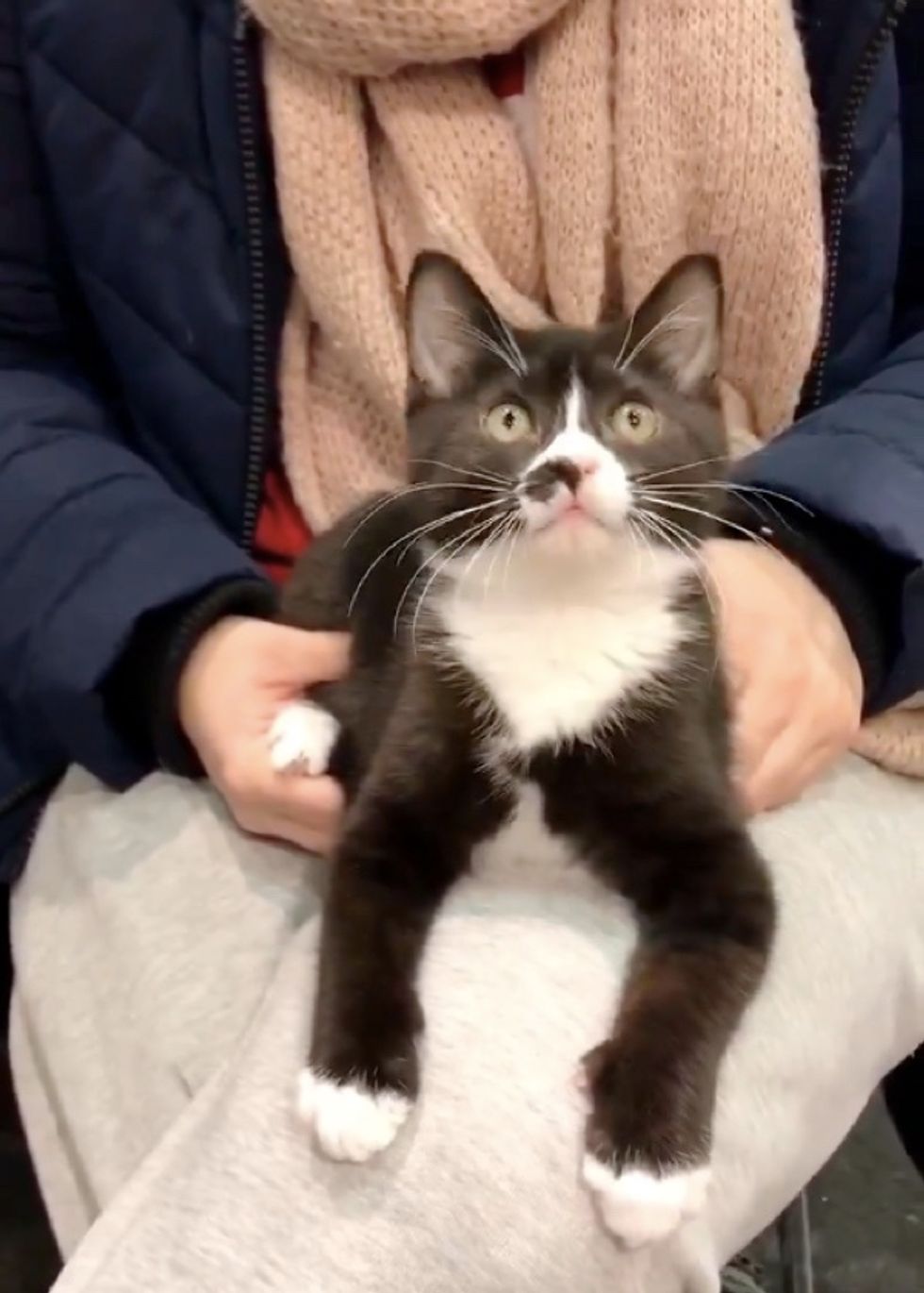 A little stray kitten found a warm lap to latch on — he wouldn't let go.