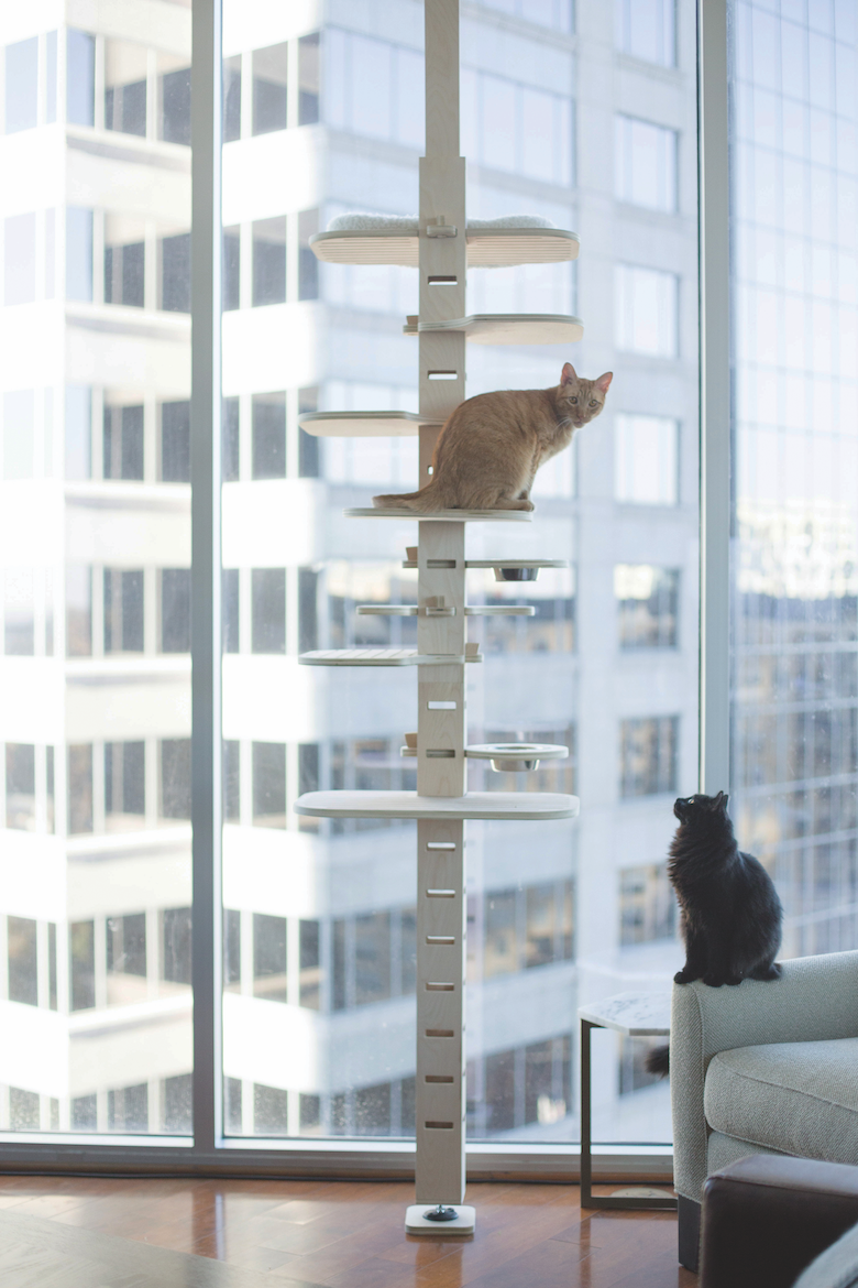 Carpeted vs. non-carpeted – Traditional cat trees are covered in carpet, which creates a cozy, non-slip surface for cats, but these cat trees can be hard to keep clean and may not be exactly the aesthetic you are looking for. There are lots of alternatives out there made from easy-to-clean materials with a sleek, modern look. Look for cat trees made from painted or stained wood that’s sealed or laminate finishes, both of which are easy to wipe clean. Instead of being completely covered in carpet, these trees often have small carpet or sisal pads attached to the platforms that add a warm, non-slip texture for cats but that are also easy to remove for cleaning and replacement.