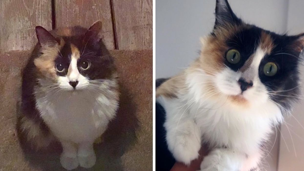 The calico was all cleaned up. She stayed at the veterinary clinic until she got a clean bill of health. "When we opened the kennel door, she walked right out and rolled on her back, begging for attention and pets," the rescue said.